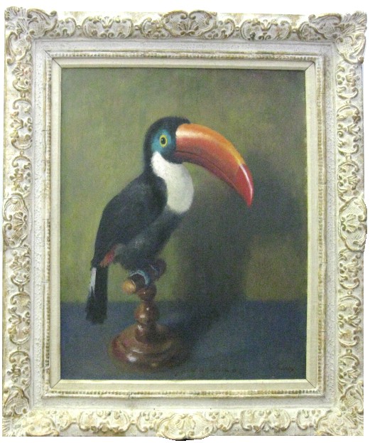 Near fine. Original painting, oil on canvas. Image 23.35 X 19.5" (59 X 49.5 CM) in 30.25 X 26.5" (77 X 67 CM) decorative carved gilt brushed wood and plaster frame. Some light wear, cracking and chipping to frame, else in excellent condition. Pencil writing visible beneath the artists signature at the bottom right (seems to include the date as 17 March 1960).