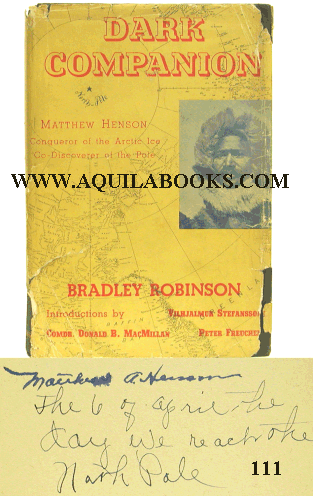 110. Robinson, Bradley. Dark Companion. London: Hodder and Stoughton, 1948. 1st UK Edition. 256pp. Very good in good to very good dust jacket. Octavo in original blue cloth with endpaper maps and chipped dust jacket with plates from photos. Covers a bit bowed and dust jacket chipped at head of spine and along top edge. Name on previous owner on verso of front free endpaper SOLD With Rare Henson Signature 111. Robinson, Bradley. Dark Companion. New York: Robert M. McBride & Company, copyright date 1947. 1st Edition. xviii,[2],266pp. Very good in fair to good dust jacket. Octavo in original black cloth with endpaper maps and quite worn, chipped dust jacket, missing large piece from foot of spine, chipped at extremities. Signed on half title "Matthew A. Henson" with added note in different pen "the 6 of April the day we reach the North Pole.". SOLD Peary’s companion on his arctic explorations, accompanied him to the pole and was a loyal supporter until he died.