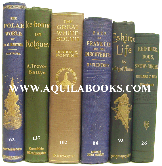 PLEASE NOTE Due to rapidly fluctuating Canadian and U. S. currencies, prices as listed in this catalogue ARE NOT CURRENT PRICES. Please contact us for a quote on an item's current price Return To Main Page Aquila Books Website CATALOGUE 105 - SPRING 2005 AQUILA BOOKS Box 75035, Cambrian Postal Outlet Calgary, AB T2K 6J8 Canada Cameron Treleaven, Proprietor A.B.A.C. / I.L.A.B., P.B.F.A., N.A.A.B., F.R.G.S. Hours: 10:30 – 5:30 MDT Monday-Saturday All Prices net in US Dollars. Accepted payment methods: by Credit Card (Visa or Master Card) and also by Cheque or Money Order, payable on a North American bank. Reciprocal trade terms apply. Institutions can be invoiced. Postage and insurance extra. Books can be returned within one week of receipt. N.B. Please advise by phone or email for specific shipping instructions. Dear Customers (both old and new). Thank you for your support for our last catalogue. We enjoyed hearing from both new and old customers. This is our second catalogue of polar books, including items on Alaska and the Yukon , which we intend to be a semi-annual event. Our interests are broad ranging and extend to ephemera, photographs, artifacts, maps and prints in addition to books. Want lists are always welcome and we encourage you to call or email regarding your specific interests.. We are also always interested in purchasing collections, large or small as well as individual items of significance. I am always ready to travel anywhere to purchase interesting material. Cameron Phone: (403) 282-5832 Fax: (403) 289-0814 Email: Aquila Books Website: http://www.aquilabooks.com/ |
