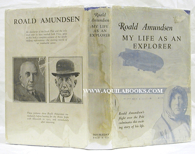 005. Amundsen, Roald. My Life As an Explorer. Garden City, New York: Doubleday, Page & Company, 1927. 1st English Translation. [viii],282pp. Octavo in original gilt lettered blue cloth, yellow top edge and scarce but worn, chipped dust jacket with 1 plate (frontispiece), and illustrations in text, including map. Dust jacket chipped at head and foot of spine and top right corner, with old dampstain affecting jacket spine and large closed tear, repaired with archival tape on back. SOLD A.B. 398; Rosove 11.A1; Spence 25. Biography with accounts of his NW Passage, and the Maud and South Pole expeditions with later attempts of flights to the North Pole, and with Ellsworth and Nobile.