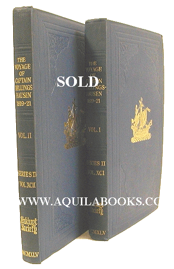 016. Bellingshausen, Thaddeus. The Voyage of Captain Bellingshausen to the Antarctic Seas 1819-1821. London: Hakluyt Society, 1945. 1st English Translation. xxx,259;viii,261-474.. Fine. Two volumes Octavo in original gilt lettered, decorated blue cloth with plates and folding maps. Edited By Frank Debenham. SOLD Rosove 33-A1; Spence 117. The first published translation of Bellinghausen's own account of his voyage to the Antarctic and around the world. "One of the greatest Antarctic expeditions on record, well worthy of being placed beside that of Cook." Hugh Robert Mill. Series: Hakluyt Society. Second Series No.--XCI and XCII