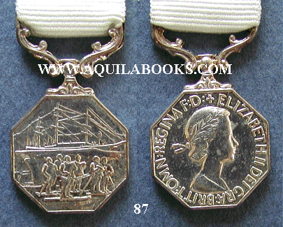 087. [Medal]. Miniature of British Polar Medal 1952-54 Issue. Fine. Miniature Octagonal silver medal (1.75cm dia.) with white ribbon 1.6cm wide, no bar. 250.00 Obverse: Die VI with Legend ' Elizabeth II. Dei: Gratia. Regina. F: D: +' Reverse Showing a Representation of the Ship Discovery in Winter Quarters with, in the Foreground, a Sledging Party on Skis.
