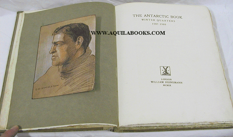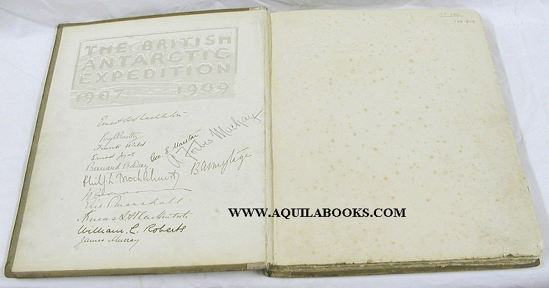 Unique Publisher’s Dummy of First Issue 126. Shackleton, Ernest H. The Antarctic Book Winter Quarters 1907-1909. London: William Heinemann, 1909. 3p.l. (half title, title page & content leaves of the Antarctic Book)) + 56 leaves (proof sheets? of text from "The Heart of the Antarctic"). Quarto in vellum backed boards, gilt top edge others uncut, with the 1st issue endpaper, with "British Antarctic Expedition 1907 1909" printed overtop a pictorial representation of Mt. Erebus (split between front and rear pastedowns) signed by 16 members, being the shore party who had wintered at Cape Royds and Aeneas Mackintosh and contents page listing "Aurora Australis: A Poem" by Shackleton. Total 10 plates, including 4 tipped-in colour plates mounted on thick grey paper stock, (portraits of the members of the Southern party), and 6 woodcut illustrations by Marston. Printed on Van Gelder Zonen paper watermarked 1907 BAE 1909. Boards showing wear with repairs to corners, soiled spine with some minor foxing to endpapers and a few plates. SOLD See Rosove 305. A1.