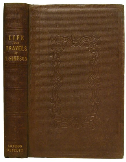 Simpson, Alexander. The Life and Travels of Thomas Simpson. The Arctic Discoverer, by His Brother. London: Richard Bentley, 1845. 1st Edition. (Hardcover) viii,424pp. Very good. Octavo. Original black decorated cloth. Gilt title. New period style yellow endpapers. Minor restoration to top and bottom of spine as well as at corners. Engraved frontispiece portrait and folding map. Portrait and map somewhat foxed as well as untrimmed fore-edge of text block. Otherwise very clean. A very attractive copy. A.B. 16116. Includes a detailed account of Dease & Simpson's explorations along the Arctic coast of America, and of Simpson's mysterious death. "Simpson was an explorer who could translate an overwhelming resolution by amazing personal exertion into magnificent achievement. Back is a man to admire, Simpson one to marvel at." - Mirsky - "To the Arctic!". See photograph.