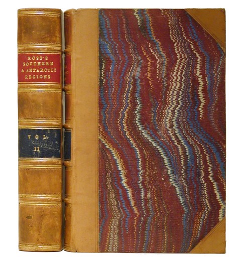 Inscribed Family Copy Ross, Captain James Clark, R.N. A Voyage of Discovery and Research in the Southern and Antarctic Regions, During the Years 1839-43. London: John Murray, 1847. 1st UK Edition. lii,(4),366; x,(4)447,(16 pages ads dated Jan, 1847.). Very good. 8vo. (14.5 X 22 cm.) Bound in 19th century tan calf and marbled boards. Five raised bands and two- tone labels. Leather corners to match. Plain brown endpapers. Spines are a little bit darkened or stained but still present well. All edges are dyed to match the end papers. The text blocks are clean and fresh. There is off setting from all of the full page illustrations. This varies from quite minor, where the original plate tissue is present, to much more pronounced on the title pages. Volume one contains a frontispiece, two folding charts, four full page maps, seven vignettes page headings, three full page illustrations, and one folding panoramic illustration. Volume two contains a frontispiece, eleven vignettes, two full page illustrations, two maps including one folding. Spence 993, Rosove 276. Presentation copy with full signature "Mary Armitage from her affectionate brother JMS C. Ross" With the 19th century bookplates of John Warren Bakewell, noted Australian. This appears to be the earliest issue of the book having the earliest dated ads according to Rosove. Presentation copies of Ross's narrative are extremely scarce. I have only seen two others in the market place. See photograph.
