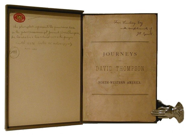 Best Association Copy Tyrrell, J. B. A Brief Narrative of the Journeys of David Thompson in North-Western America. Toronto: Copp, Clark Company, 1888. 1st Separate edition. 28pp. Very good. 8vo. Original printed wrappers. Spine has been renewed. Some old water spots and soiling on the front wrapper otherwise a very nice copy. Housed in a fold over buckram box. Peel 1080; Howes T 450; Smith 10376 This pamphlet represents the first real work done on David Thompson. It was read before the Canadian Institute March 3rd, 1888. Tyrrell in his introduction to the 1916 Champlain Society edition relates the story of his interest in Thompson and his contact with Charles Lindsey who at that time owned the original manuscript of the narrative. Tyrrell obtained the manuscript from Lindsey and after many years the Champlain Society published it. This example of Tyrrell's rare pamphlet is inscribed to Chas. Lindsey, making it probably the best association copy available. Also with the small round leather bookplate of Neva and Guy Littell. See photograph.