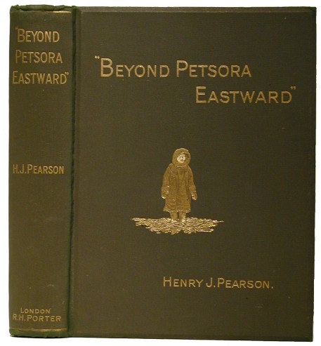 Pearson, Henry J. "Beyond Petsora Eastward." Two Summer Voyages to Novaya Zemlya and the Islands of Barents Sea. London: R. H. Porter, 1899. 1st Edition. xiv,335pp. Very good, no dust jacket. Octavo in original gilt lettered, decorated green cloth with bevelled edges and black coated endpapers with colour frontispiece (bird eggs), 88 B&W plates from photos, illustrations (maps and plans) in text, and 2 folding maps (at end). Fine copy. Appendices by Colonel H. W. Feilden--On the Botany and Geology. AB 25015. With the engraved armoural bookplate of A.L. Clarke.