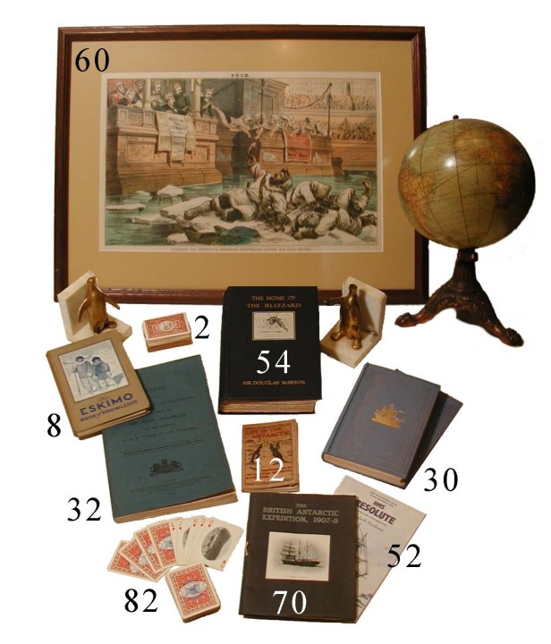 [Shackleton, E.H.]. The British Antarctic Expedition 1907-09. [Exhibition Catalogue]. London: N.P., 1909. 1st Edition thus. 24pp. Very good. Small quarto. Original printed string tied wrappers with an added cover illustration of the Nimrod in the Ice. Fronitis port. 4 pages of ads at the beginning and two at the end. Very slight edge wear otherwise in great condition with the original glassine over the portrait. Taurus 62. Wonderful exhibition catalogue on the British Antarctic Expedition 1907-09. On display were sledging flags, gramophones, food, instruments, photographs, specimens collected and Marston watercolours. The ads all relate to the expeditions sponsers. The display was conducted on board the Nimrod and an expedition member was on hand at the time. Very scarce. See photograph.