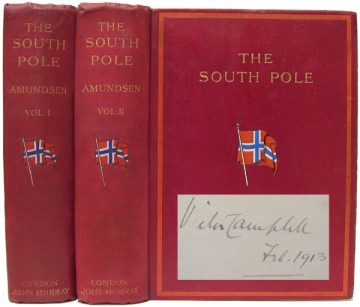 Amundsen, Roald. The South Pole. An Account of the Norwegian Antarctic Expedition in the "Fram," 1910-1912. London: John Murray, 1912, 1st UK Edition. (Hardcover) xxxv, 392; x449pp. Very good. Numerous photo plates, maps, some folding. Original decorated cloth, t.e.g. Minor wear and a bit of spotting on the endpapers. Old library stamp, marked withdrawn on the front endpaper of each volume, otherwise a clean attractive copy. Both volumes signed and dated by Victor Campbell on the front paste downs. Spence 16. Taurus Collection 71, Rosove 9.A1 First edition in English, published the year before the New York edition and quite scarce. Amundsen had originally planned an expedition to repeat Nansen's drift with the Fram through the Arctic Ocean, and presumably to try for the north pole, but support for the project fell with the announcement of Cook's & Peary's accomplishments. He then turned toward the south, even though Scott's plans to attempt the south pole were well known, and was severely criticized (mostly in Great Britain) for competing with Scott. The two polar journeys were in marked contrast, and form part of one of the greatest dramas of exploration - Amundsen made the trip with dogs and skis, and with little difficulty, reaching the pole a month before Scott's party; Scott and four others reached the pole, but died on the return, just short of safety, after an heroic but ill-planned trip, dragging their own sleds. This set bears the ownership and annotations of Lieut. Victor Campbell, who was in charge of the Northern party. See colour illustration.