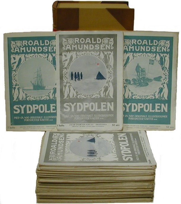 Amundsen, Roald. Sydpolen: Den Norske Sydpolsfaerd Med Fram 1910-1912. Kristiania: Jacob Dybwads Forlag, 1912, 1st norwegian edition. (4),528; (8),424 pp. Very good. Octavo (16 X 24 cm.) Original printed wrappers in 40 parts. Parts 1-22 constitute Vol. 1 and Parts 23-40 are Vol. 2. Portrait of author as frontis and 47 other plates. 4 charts, 2 folding and 3 sketches. 306 illustrations in text. Instructions to the binders in the front of part one. Original printed wrappers are a bit worn and have a few splits on the spines. Each wrapper has a photographic illustration in the centre of the wrapper and is surrounded by a penquin decorative border. The first two wrappers are printed in silver and the last 38 are printed in a blue-green colour. Generally an extremely nice set. Housed in a very attractive fold over curved leather backed box. Rosove 8 A1. Very rare complete set of Amundsen's classic South Pole in the original parts issue. Rosove points out in his bibliography the circular image varies in the sets he has examined with our set being a further variant. Rosove was only able to examine 3 sets, one at Dartmouth and 2 at SPRI. Only the second set of which we have seen for sale. The first being in Christie's sale Fram 7261, 27th September 2006. This set made 5040 Pounds. A great opportunity to acquire a very rare Amundsen item for Christmas! See colour illustration.
