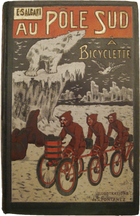 Salgari, Emilio. Au Pole Sud a Bicyclette. Paris: Librairie Ch. Delagrave, [circa 1908], 2nd Edition. 240 pp. Good to very good. Tall octavo. Original blue cloth with pictorial front board. Illustrated spine. Beveled boards. All edges gilt. Title page vignette. Numerous intext illustrations. Paper quite heavily browned as usual. Front board and spine have minor abrasion and wear but still very attractive. Illustrations by Cazenove and Fontanez. Wonderful fictional travels in the Jules Verne tradition. I can just see Amundsen, Scott and Shackleton on the bicycle now! See colour illustration.