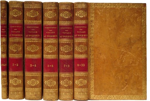 D'urville, M.J. Dumont. Voyage Au Pole Sud et Dans L'oceanie Sur Les Corvettes L'astrolabe et la Zelle, Execute Par Ordre Du Roi Pendand Les Annees 1837-1838-1839-1840,. Paris: Gide, 1841-1946, 1st Edition. lxxxii,295; (iv),363,(4); viii,451,(2); (4),(2),410,(2); viii,428,(2); (4),344,(2);(4),346,(2); (4),391,(1); (4),362,(4),318,(1) pp. Near fine. Octavo. Original full tree calf bindings. Marbled endpapers. Gilt decoration on boards. Spines ruled in five compartments. Title label and volume label in red morroco. All edges marbled to match. Two volumes bound together, each with the half title at the front of each volume and the table of contents leaf at the rear of each volume. Atlas volume is bound to match and includes 9 folded maps. Each volume has a small armoural bookplate on the pastedown. A very attractive set. Rosove 105, Hill p89. Very scarce especially with the atlas volume which is often missing. Hill states "The aims of this expedition were to explore the south polar regions and various island groups in the Pacific. The expedition reached the ice pack in January 1838 but failed to penetrate it or get south of the 64th parallel." See colour illustration.