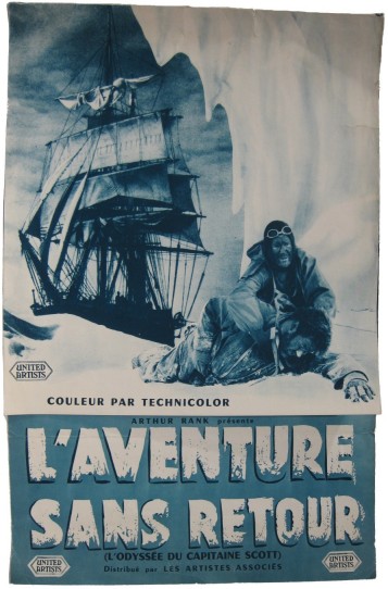 [Scott, Robert F.]. L'aventure Sans Retour (L'odyssee Du Captaine Scott) (Scott of the Antarctic) Movie Poster. Paris: Arthur Rank, [circa 1948]. Near fine. Tall movie poster (23.2 X 62 CM unfolded) which opens vertically revealing a summary of the film and several other images. Printed in two colours. The rear of the poster has four other images and the film credits. Several small closed tears otherwise in very nice condition. This is the poster for the French issue of Scott of the Antarctic starring John Mills and Diana Churchill as Kathleen Scott. Although the film was woefully inaccurate, John Mills performance and the great cinematography makes it a must see film. This poster is not as spectacular as the British versions still an attractive bit of Scott ephemera. See colour illustration.