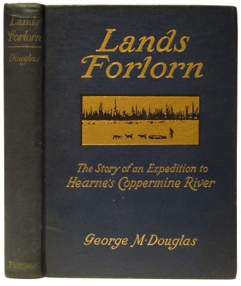 Douglas, George M. Lands Forlorn. A Story of an Expedition to Hearne's Coppermine River. New York: Putnam's Sons, 1914, 1st Edition. (Hardcover) xv,285pp. Very good. Octavo in original gilt lettered blue cloth with color frontispiece (portrait), many B&W photo illustrations in text, and folding map. Minor wear to extremities. Arctic Bibl. 4074. Story of a three man expedition to the Coppermine via Great Bear Lake, a winter at Great Bear, then down the Coppermine to its mouth the following summer. See colour illustration.