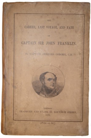 Osborn, Captain Sherard. The Career, Last Voyage, and Fate of Captain Sir John Franklin. London: Bradbury and Evans, 1860, 1st Edition. vi,(2),111,(1). Very good. 16 mo. (17.5 cm.) Original decorated and printed paper covered boards. Frontispiece. 7 full page illustrations. Portrait of Franklin on the title page and front board. 3 partial page maps in text and one full page map. Single partila page illustration on the last page. Boards are somewhat soiled and the spine has been renewed. The contents are generally very clean and free of foxing. Arctic Biblio. 12893 This very scarce, brief biography of Franklin details his career, last voyage and the search for him. Reprinted in the collected edition of Osborn's works but without title page and plates. See colour illustration.
