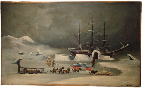 Cedar, A. Arctic Oil Painting Showing a Three Masted Ship Wintering in the Ice. Np: , [circa 1880-00]. Very good. Oil painting on canvas (90.5 X 54 cm.) the canvas has been removed from its stretcher and mounted on masonite. The image has a bit of surface crazing, overpainting, and certainly could use a good cleaning. The image is certainly stable at this point. Interesting somewhat naive image of a three masted ship wintering over in the ice, surrounded by the winter huts, protective ice barriers and showing the daily outdoor activities. The ship somewhat resembles Peary's Roosevelt but we can find no illustration in any late 19th century/early 20th century published narrative that is similar. Perhaps the artist was just painting something he had read about. We can find nothing about the artist having looked in all of the standard references. See colour illustration.