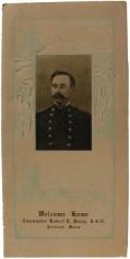 Peary, Robert E. Reception and Banquet Tendered the Distinguished Explorer Commander Robert E. Peary U.S.N. By the Citizens of Portland and South Portland at the Falmouth Hotel, Portland Maine. Portland: Board of Trade, 1909, 1st printing. 4 pp. Near fine. Tall octavo. Original green printed decorated wrappers. Silver glitter inlay to front wrapper. Small vignette illustration at the top of each page. Minor soiling and aging but a very attractive copy. This is a wonderful and quite elaborate menu was for attendees at the banquet. The menu included Esquimaux Potatoes, Peary frozen punch and North Pole ices. Many local dignitaries spoke including Peary himself. Prime arctic ephemera. See colour image.