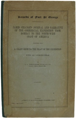 Ayyar, A.V. Venatarama. Records of Fort St. George James Strange's Journal and Narrative of the Commercial Expedition from Bombay to the North-West Coast of America Together with a Chart Showing the Tract of the Expedition. Madras, India: Superintendent Government Printing, 1929, 2nd Edition. 63pp. Very good. Folio. Original printed paper covered boards. Green cloth spine. Large folding map. Minor soiling on boards. Evidence of a small paper label removed from front board. Overall an attractive copy. A.B. 17097 Howes 1064 Bookplate of Huntington Free Library on the front paste down. A small lot of correspondence from the Librarian and the Publisher is laid in loosely. It would appear that there were only 210 copies of the book issued in two printings, the first of 110 copies in 1928 and the second of 100 copies in 1929. The number of copies printed is on the large folding map. See colour illustration.
