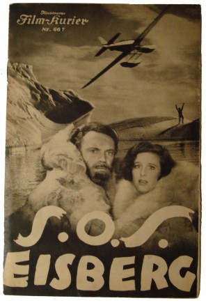 [Riefenstahl, Leni]. S.O.S. Eisberg. Berlin: Deutsche Universal Film, [circa 1933], 1st printed edition. 8 pp. Very good. Original printed wrappers. Mostly illustrations with a small text block on each page. Several pages have a professional repair to an old tear. Advertising brochure for the Film S.O.S. Eisberg (S.O.S. Iceberg). This early U.S./German co-produced film was directed by Arnold Fanck and starred the German beauty Leni Riefenstahl. The production was partially filmed in Greenland and many of the images show great northern scenes including: icebergs, Inuit people, and polar bears. Very scarce ephemera related to early photography in the north. See colour image.