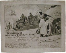 Scott, Robert F. Savage Club Welcome Home Dinner to the Officers of the National Antarctic Expedition Saturday Nov. 5th, 1904 W.E. Smith in the Chair Signed by Scott and Five Other Members of the Expedition. London: Savage Club, 1904. Very good. Single image printed on heavy card stock. Menu for the dinner printed on the reverse. Image has minor to moderate foxing with a few small spots of surface abrasion, this mostly visible in the blank margin. The rear of the menu has some minor soiling. The Savage Club, one of the Gentlemen's Clubs in London, is noted for producing these very graphic menus. Such other notables as Nansen and Stanley have been honoured with Dinners. Our menu is signed in the top left hand corner by the following members of the expedition: R.F. Scott, Reginald Koettlitz, R.W. Skelton, H.T. Ferrar, Lieut. Mulock, and L.C. Bernacchi. The Wonderful image shows a sled being pulled by a polar bear stopped in front of the Savage Club and being greeted by several African gentlemen. Several of the signatures are a bit faded but overall are quite clear and distinct. Framed, the menu would make a wonderful addition to the library. See colour illustration.