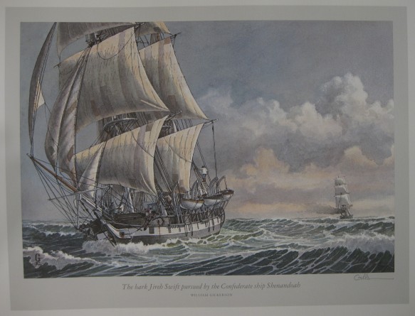 The bark Jireh Swift pursued by the Confederate ship Shenandoah Signed by William Gilkerson (#127001): $100 Unsigned (#127002): $50 |