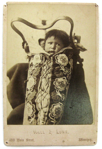 A very beautiful image. C 1885-1888. Papoose in wonderful cradle board. See similar image we also have in stock with mother holding what appears to be the same papoose. Beautiful flower decoration on wrap. On back studio card reads "Hall & Lowe Artists and Photographers 499 Main Street (Opp. City Hall) Winnipeg" surrounded by flower decoration. The photographers name and address are also printed on the front of the card below the photograph.