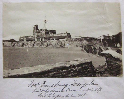 The final photograph on the back of the page (thought not to be a Gentile) shows a view of Fort Dansborg from a viewpoint overlooking a wall. The fort, situated in the Indian state of Tamil Nadu looks out over the Kaveri river.