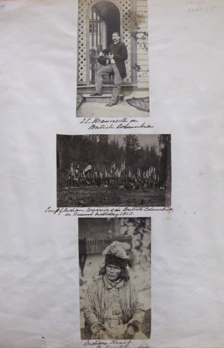 Gentile, Carlo [Charles]. Four Original Photographs Mounted on Album Page: "D. L. Maunsell in British Columbia", "Group of Indian Warriors in British Columbia on Queens Birthday 1865", "Indian Chief British Columbia" and "Fort Dansborg, Tranqibar Built by Danish Government in 1867 Sold to England in 1856".