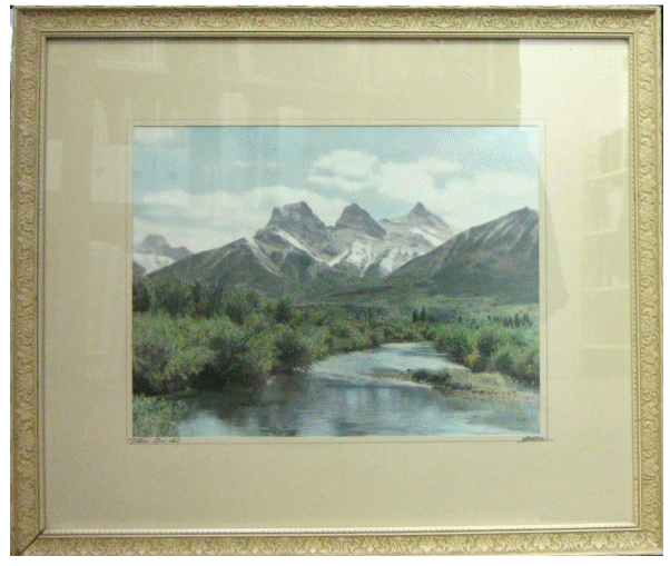 [Original Hand-Coloured Photograph]. Banff, Alberta: , [circa 1920]. Near fine. Original hand coloured photograph. Image measures 9.75" X 12.75" (25 X 32 cm). Housed in 1" decorative wooden frame painted beige. Frame measures 17" X 20.5" (43 X 52 cm). Beige matting with navy linear border around image. Some wear and chipping to frame. Signed in pencil on the matting to the bottom right of the image. Title on matting at bottom left of image, also in pencil. Image is crisp with detailed hand colouring in a variety of tones. A very nice photograph.