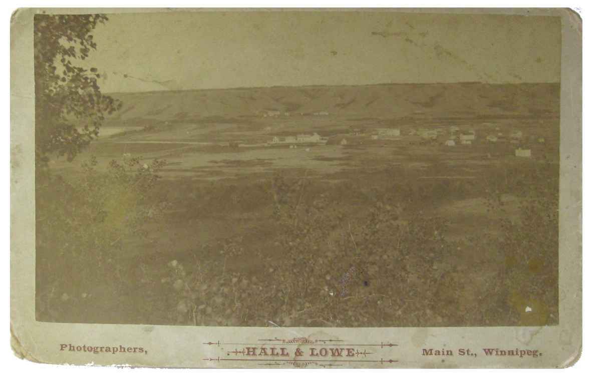 Photograph looks out over a flat expanse of landscape and cluster of buildings in the distance. Fort Qu'Appelle is a town in southern Saskatchewan, Canada "located in the Qu'Appelle Valley 70 KM NE of Regina between Echo and Mission Lakes". It was originally established in 1864 as a Hudson's Bay Company trading post. in 1882 Hall took on Lowe as a partner in his photo studio in Winnipeg. Hall & Lowe advertised “Indian photos (taken from life), Xmas cards, views of Winnipeg” as well as images of horses, cattle, machinery, and buildings. But they did not confine themselves to taking studio portraits and landscapes around Winnipeg. In 1883 they also took pictures along the Canadian Pacific Railway line east and west (presumably it was on one of these trips that this photo was taken). In 1884 Hall took a trip out west and by the following year both men had left Winnipeg. In 1885 Lower had established a branch of their operation in Victoria, BC. In 1887 Hall opened a new studio at Vancouver. Their partnership dissolved in May 1892, when Hall became the sheriff of Vancouver.