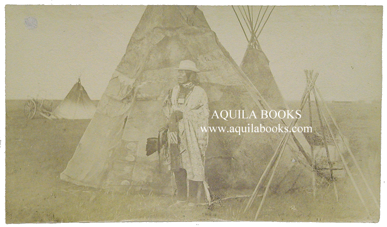 # 118 - 152 Original Albumen. Cree Native Male in Traditional Clothes, "Red River Cart", & Decorated Teepees. [From an album of related images : See Prairie CPR 1885, Teepees in Boreal Forest, Gathering at Teepee] Photographer: Unidentified [Possibly Steele & Co.] Original 19th Century Albumen Image. Mounted on thin card 10 1/2" x 5 8/16" Image is 7 3/16" X 4 1/8" Price: $850.00 USD Please Inquire |