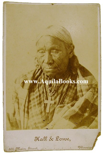 "First Nations Elder" Female. [no date]. Original 19th Century on studio card. Unidentified First nations female [handwritten note on reverse: Old Squaw 105 years] wearing a crucifix on an elaborate chain. Photographer: Hall & Lowe. Winnipeg. Ca. 1877-1886 Original 19th Century on studio card. Card: Card: 6 1/2 " X 4 1/4" Image: 5 7/16 " X 3 15/16". Price: $600 USD INQUIRE |