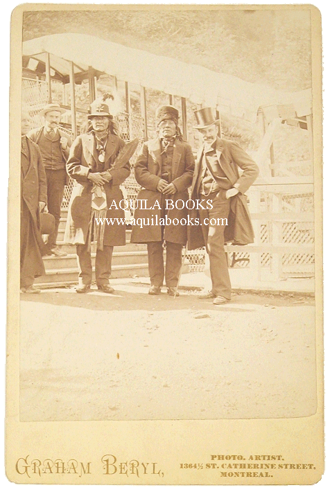Montreal Original 19th Century. Mounted on 6 1/2" X 4 1/4" card. Image is 5 1/2" X 3 7/8" On or about October 3, 1886; during Crow Foot's trip to Ottawa, via Quebec City, and Montreal. L - R: Father Albert Lacombe; Unknown; Crowfoot; Three Bulls [Crowfoot's foster brother]; unknown. [Also see: Red Crow Group] Price: $1500.00 USD Please Inquire |