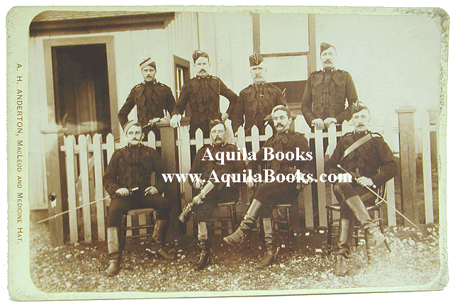 Original Albumen Image: North-West Mounted Police. Officers in front of officers mess, Fort MacLeod, Alberta. Samuel Benfield Steele 1851 - 1919 [Who Was Sam Steele?] On reverse, handwritten note by Harwood Steele, son of Samuel Steele: " '42' gp officers MacLeod before 1895. Supr. S. B. Steele has both hands on fence. Supr. A. R. Macdonell beside him. Dress Patrol Jackets." Photographer: A. H. Anderton, MacLeod and Medicine Hat. Ca. 1893 Original Albumen Image mounted on studio card: 9 1/2" x 6 1/4" Image: 7 5/16" x 4 7/8" Price: $750 USD SOLD |
