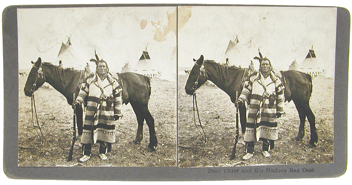 # 118 - 288 Original Stereo view. "Bear Chief and his Hudson Bay Coat" Bear Chief / Piegan. Browning, Montana. Photographer: N. A. Forsyth, Butte, Montana Ca. 1900 - 1905. Original early 20th Century Stereo view. 6 15/16" x 3 1/2" Price: $300 USD SOLD |