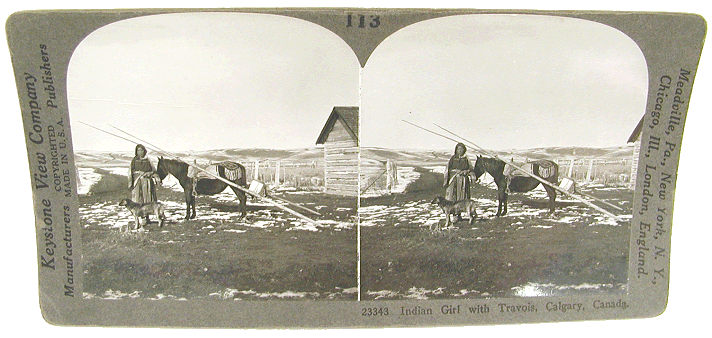 # 118 - 275 Original Curved Stereo view. "#23343 Indian Girl with Travois, Calgary, Canada" Keystone View. Photographer: Not attributed. Original early 20th Century Stereoview. 7 " x 3 1/2" Price: $75 USD Please Inquire |