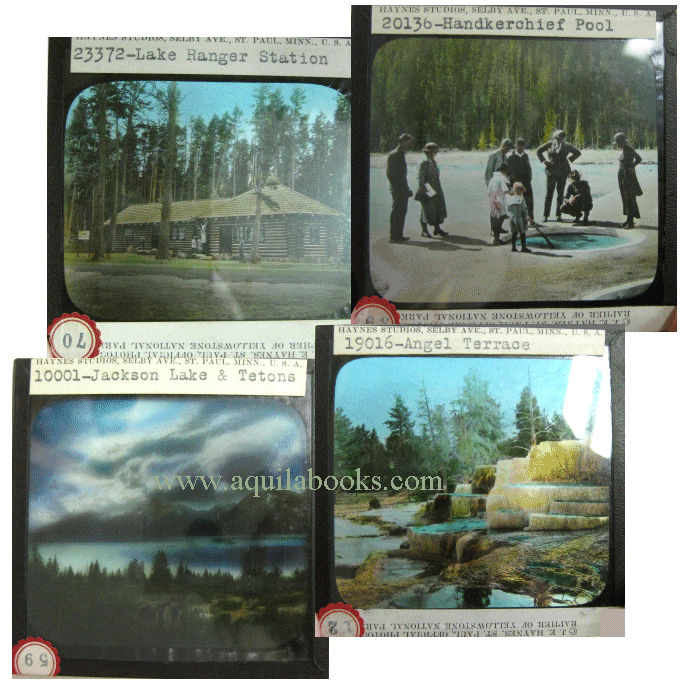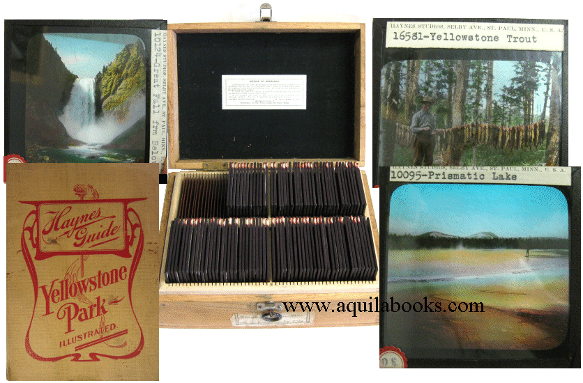 ST Paul, Minn.: Haynes Photo Studio, [circa 1900]. Very good. Set of 100 hand-coloured lantern slides. No broken images. Each slide is numbered and captioned with the image clear and brightly coloured. In original wooden slide box with some staining and wear. Black cloth lining in top of a box with a 'Notice to the Operator' affixed discussing proper slide use. Box closes with a metal clasp and ring (both slightly rusty) a worn sticker beneath the clasp provides instructions regarding the case and ring. Also included is the "Haynes Guide - Yellowstone Park - Illustrated" a small 12mo in orange wrappers (showing some soiling with wear and small tears to end of spine). 143 pages with folding map at end as well as many B/W illustrations and diagrams. A beautiful set of slides supplemented wonderfully by the book containing the photographer's images and pertaining to the same subject matter.