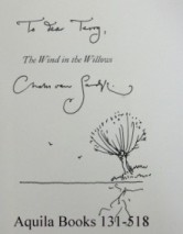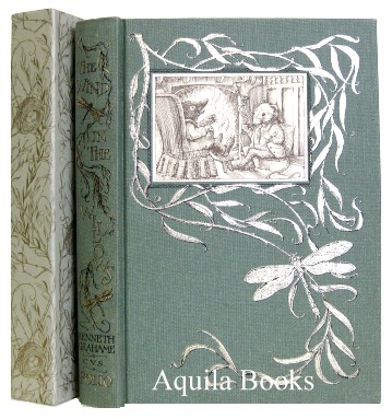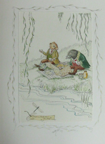 The Wind in the Willows (Written by Kenneth Grahame, special edition illustrated by Van Sandwyk) #129494 - 1st LIMITED ed. of 100 numbered and SIGNED copies. SOLD Folio Society (2008), 280pp, London. Quarto (13" X 9.75"). Quarter vellum binding blocked in 22-carat gold with vellum tips and paper sides blocked in three metallic foils. Gilt top edge. Roughly 100 illustrations and 16 tipped-in colour plates with a hand-printed etching tipped onto the limitation page. With an Original full page watercolour by Van Sandwyk tipped in as a frontispiece. Comes in a cloth-bound solander box. In flawless condition. Copy number VI of 1000. This Folio Society edition follows the original 1908 Methuen and Co text. Signed by Van Sandwyk on the limitation page. The watercolour which is unique to this copy of the book is of Ratty and Mole having a picnic on the riverbank. A truly unique copy. ~ ~ ~ ~ ~ ~ ~