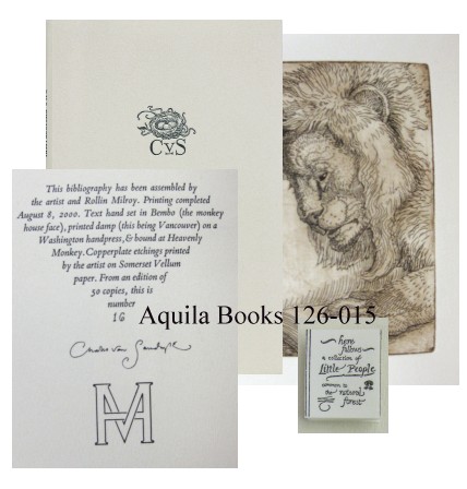 Charles Van Sandwyk. An Interim Bibliography. 1983-2000 #126015 - SIGNED Limited ed., 2000 SOLD SOLD Unpaginated. Card covers. Number 16 out of 50 signed, limited edition copies. Octavo. Illustrated with 2 inlaid tinted etchings, one of a lion reading a book and the other of a monkey "thinking". Small facsimile of the author's first book (entitled "Here follows a collection of Little People") with 4 pages of illustrations. Original cream card covers with Van Sandwyk's initials and etching of bird's nest on front cover. A fine copy. This copy also includes the original publishers prospectus for the book. ~ ~ ~ ~ ~ ~ |