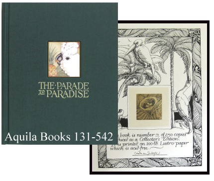 The Parade to Paradise; An Illustrated Fable - #131542 Collector's Ed., 1992 SOLD Summer Wild Productions. Hardcover. 48 pp. 10.25 X 8.25 inches. Text and watercolour illustrations printed offset. Illustrated colophon (p. 1) incorporating a tipped-in etching. Text set in Hadriano, with calligraphic initial letters by the artist. Case bound in dark green cloth with green imitation marbled endpapers. Inlaid colour illustration and title stamped in gilt on front board. Unprinted tan dust jacket. Special collector's edition of 114/250 copies. Signed by the author on special edition page. |