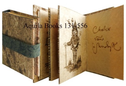 Here Follows a Collection of Little People Common to the Natural Forest #131556 - SIGNED, 1st ed., 1983 SOLD 1.25 x 1 inches. 5 pages. Calligraphic text and illustrations printed from original engraving. Edition of 50 copies. Published by the artist. Printed on Somerset paper from a single etching, divided into 5 pages. Accordion fold, glued to inside front limp of case. Issued in three bindings- this one marbled paper. Small green paper loop to hold the book shut. A fantastic, true miniature book. The first book by Charles Van Sandwyk. EXTREMELY RARE. Signed on last page by Van Sandwyk. |