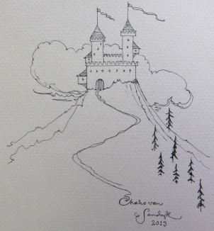 SIGNED 1st ed. with original drawing On the page opposite the title page Charles Van Sandwyk has drawn an original, unique and detailed image depicting a fairytale castle sitting atop a peaked hill top. The drawing measures 5" X 5" and is signed beneath (and dated 2013). Placed loosely inside is a short biography and artist statement. ~ ~ ~ ~ ~ ~ ~ |