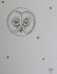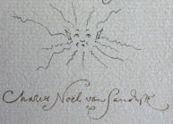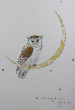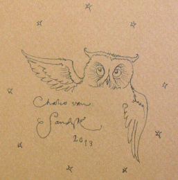 # 134014 SIGNED 1st ed. with three original drawings SOLD An extra beige sheet of textured paper, rough on the sides, has been added after the cover page on which the drawings are done. A small sheet of thinner paper was also added for this copy following the first sheet. The first drawing is a small gold shooting star (1.5" X 3") on the first page after the wrappers. On the other side of this page Charles' has drawn a wonderful owl perched upon the moon and surrounded by stars. The image is hand coloured using gilt and brown tones, measures 5.5" X 4.5" and is signed beneath and dated (August, 2012). The final hand drawing, placed on the inner side of the final page, shows an owl's eyes and nose in a circle frame and is surrounded by small stars. This measures 2" X 2", is highlighted with spots of gilt and has the initials C.V.S. Below. A beautiful copy of a wonderful book made extra special by the fantastic hand drawn additions. |
