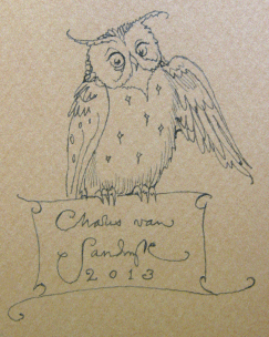#134009 SIGNED 1st ed with original drawing SOLD This copy with a unique drawing by Charles Van Sandwyk on the page opposite the title. The original hand drawn image depicts a whimsical little owl, raising one of it's wings and perched atop a decorative frame which contains Charles' signature and the date (2013). The image measures 2.5" X 2.5". Also included, placed loosely inside, is a small pamphlet containing a short biography and artist's statement. |
