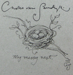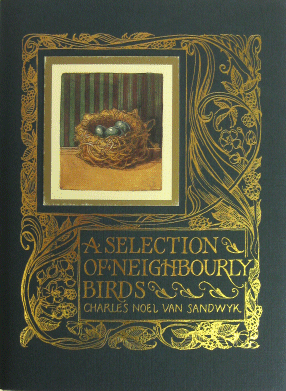 A Selection of Neighbourly Birds of the New World (Canada) 24 pages. Small octavo. 6.5" X 4.75" (17 X 12.5 cm.) Bound in original purple stiff paper boards. Deep green paper wrapper with detailed decorative gilt stamping and onlay image of a nest. Ten colour illustrations including title page. Complete with the separately laid in bookmark. Charles's 11th work. Scarce. #128674 - SIGNED 1ST [1995] SOLD # 134018 - SIGNED 1st ed, with original drawing SOLD This copy with an original hand drawn illustration by Van Sandwyk on the title page. The drawing depicts a nest in a branch containing eggs. Beneath the drawing is written "my messy nest" and Van Sandwyk has signed just above the drawing. |