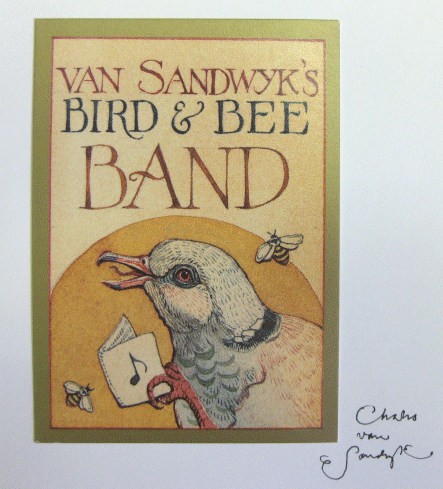 Van Sandwyk's Bird and Bee Band #134041 SIGNED SOLD CVS Fine Arts. Small 5" X 4.75" (12.5 X 11.5 CM) book. Red card covers with onlayed title and bird illustration. Accordian style fold out pages. On one side of the accourdian pull out is depicted richly coloured birds playing a variety of instruments (spans 6 'pages'). The opposite side is bare except for the title on the first page. This page has also been signed by Charles Van Sandwyk in black ink. A very interesting little book. |