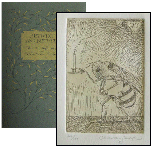 Betwixt and Between. The Art and Influence of Charles Van Sandwyk UBC Library. # 134069 - SIGNED limited edition with etching SOLD 2011. Unpaginated. Vancouver, B.C. Octavo. Original illustrated, hand-bound green wrappers with gilt lettering and foliage decoration. Various sketches and paintings of animals and fantasy themes throughout. This edition includes an additional page before the title page containing an limited edition etching (46/100) of a beautifully detailed bee holding a candle and a book. The image is signed and numbered beneath. On the back of the first page Charles has inscribed "This publication really came about because of the kindness of my high school mentor George Knepp". The inscription is also signed beneath and dated Sept 1st 2012. A wonderful copy. A beautiful limited edition etching and special inscription make this book especially fantastic. |