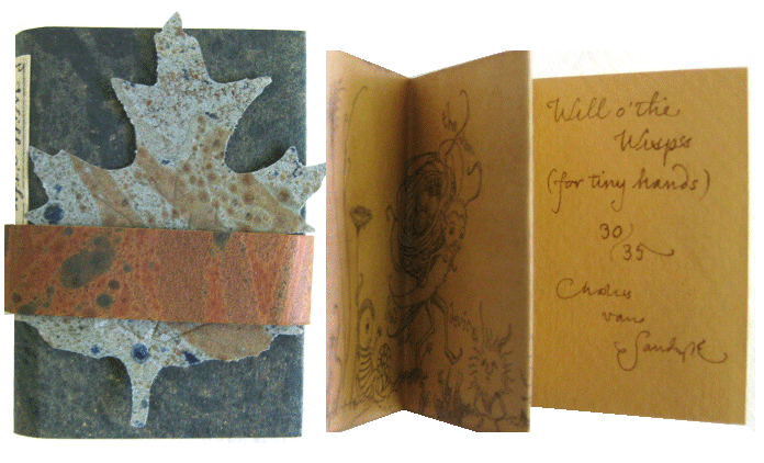 Will o' the Wisps (For Tiny Hands) #134070 - SIGNED, limited ed. of 35 copies SOLD 2.5" X 1.75" (6 X 4.5 CM). Dark green marbled card wrappers. Title onlay on the spine. Accordion fold style beige pages. With 9 pages of illustration and writing (on only one side of paper, other side blank). Eight pages show a beautiful etching with many magical creatures with the final page containing the manuscript title, edition number (out of 35) and Van Sandwyk's signature. Book is held closed with a brown marbled paper loop that slides on and off. Stuck loosely under the loop is a green marbled cut out leaf, embossed with veins, which Van Sandwyk has also signed the back of. A wonderful, tiny little book. A rare little limited edition book signed twice by Van Sandwyk- a great addition to any collection of the artist's work. |