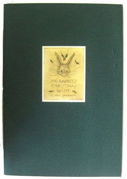 Mr. Rabbit's Christmas Wish [Signed Limited Artist's Proof with Seven Etchings]. Vancouver, B.C.: Charles Van Sandwyk Fine Arts, 2002, One of four copies, artist's proof, all manuscript with 7 etchings. Unpaginated. Fine. Quarto. Simple green cloth covered wrappers with onlay etching title. Slight fraying to fabric at edges. Red card inside wrappers. Light green endpapers. Contains seven etchings (including front title and title page), a few of which have hand-coloured highlights. All inner text is manuscript with a festive hand-drawn decoration on front free endpaper. All edges of pages uncut. Signed on the inside of the rear endpaper by Van Sandwyk. A beautiful edition of this Christmas favorite. One of four copies made at the time. Artist's proof with several beautiful etchings of charming animals. Many of these same etchings were reproduced in the trade edition of Mr. Rabbit's Christmas wish, however, the mouse and cheese was not used. The effect of the original etchings is very different in this elegant and scarce version as compared with the trade edition. SOLD Aquila Books # 136523.....SOLD ~ ~ ~ ~ ~ ~ ~ |