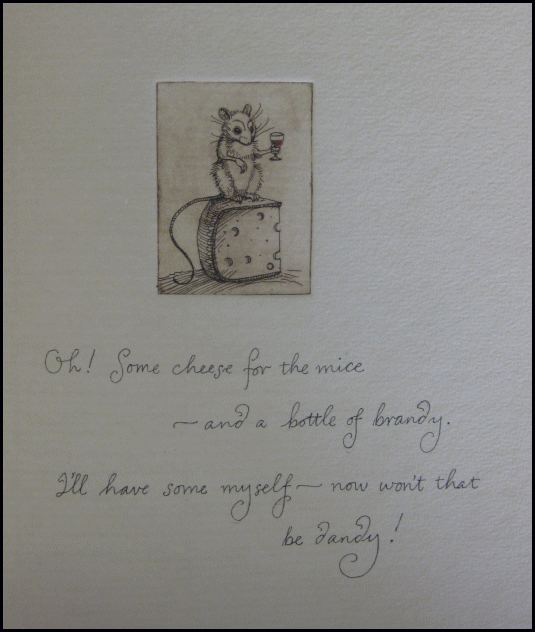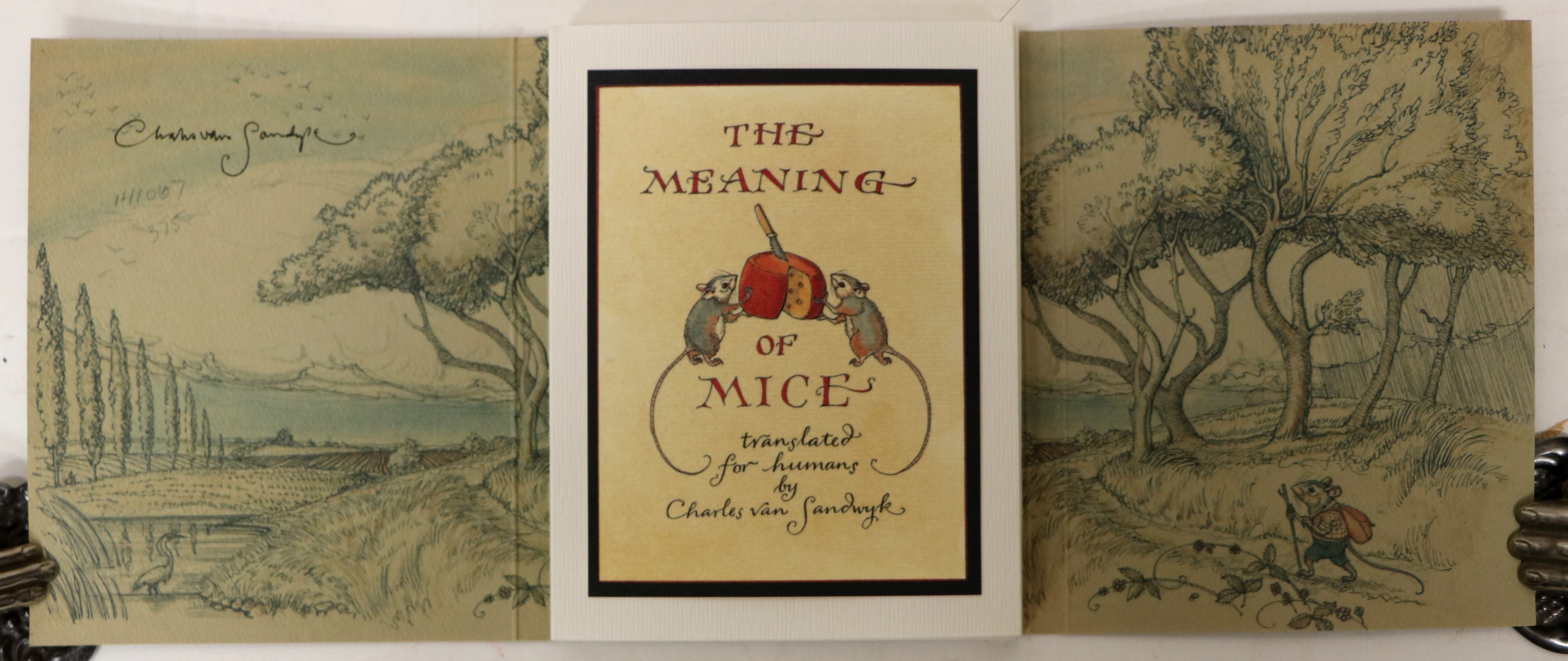The Meaning of Mice with Signed Press Proof Page Translated for humans by Charles Van Sandwyk #131532 1st ed., 2002 SIGNED with press proof page also signed SOLD Very rare. [11 pp]. The Fairy Press (A Division of Charles Van Sandwyk Fine Arts). Octavo. 10 X 13cm (4X 5"). Bound in original green stiff paper boards (wrap around). Paste down title and illustration of mice on front cover and on title page. Illustration on inside of wrappers. Accordion style fold-out with illustrations and writing on one side. 11 pages with writing and illustrations separated by folds. A lovely little book. Accompanied by a large press proof page on unique paper. Page measures 13.5" X 20" and is printed on one side with the same images, and in the same quality, as in the book itself. The page is signed at the center by Van Sandwyk. Both the book and press proof are signed. Scarce. ~ ~ ~ ~ ~ ~ ~ |